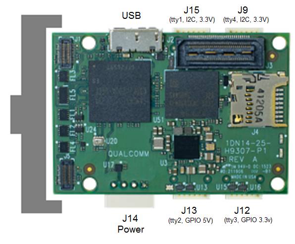 "这款" Qualcomm® Snapdragon Flight™ 套件(开发人员版) 它的体积很小(58x40 毫米),但却拥有强大的 CPU 处理能力和两个板载摄像头。它包含 4 个运行 Linux(默认为 Ubuntu 14.04 Trusty)的 "Krait "ARM 内核和 3 个运行 QURT 实时操作系统的 "Hexagon "DSP 内核。此外,它还包括 Wi-Fi、蓝牙连接、载具级 GPS 和许多其他功能。