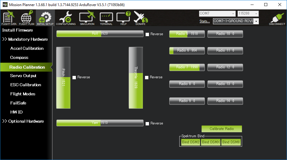 打开Mission Planner地面站的 初始设置 | 强制硬件 | 无线电校准 筛查
