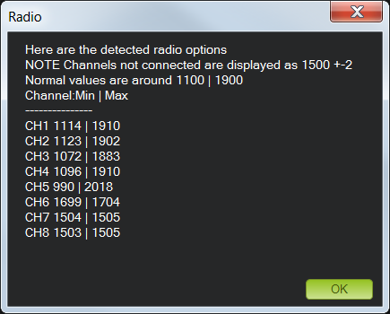 Mission Planner地面站将显示校准数据摘要。正常情况下,最小值约为 1100,最大值约为 1900。