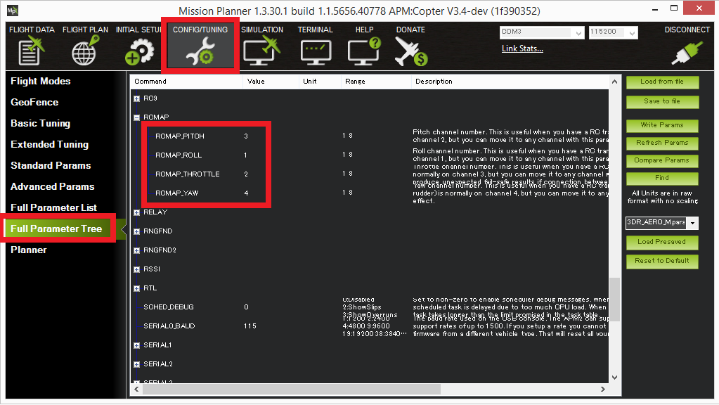 可以通过设置 RCMAP_ROLL, RCMAP_PITCH, RCMAP_THROTTLE 和 RCMAP_YAW 参数,使用 Mission Planner地面站's 配置/飞行稳定调整 | 完整参数树 (或完整参数列表),如下图所示。