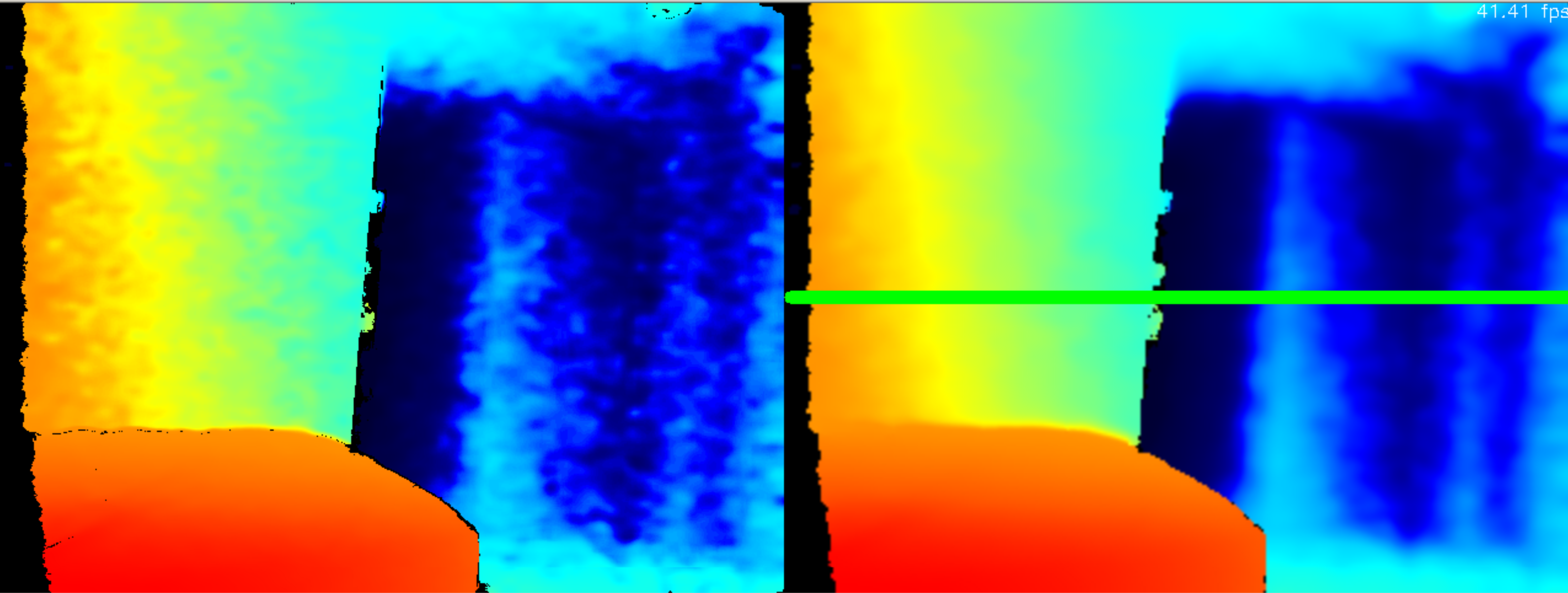 • 首先,重要的是要在 未经加工的 深度图像,以避免黑洞和噪音,并对数据进行总体改进,从而获得更稳定的结果。下面是完整的 过滤器列表 脚本中包含的过滤器,你可以单独启用它们。要测试不同过滤器的设置,可以使用 rs-深度-质量librealsense 或运行示例 opencv_depth_filtering.py 脚本下图展示了原始(左)和过滤后(右)的深度图像,水平线是我们计算与障碍物距离的位置。