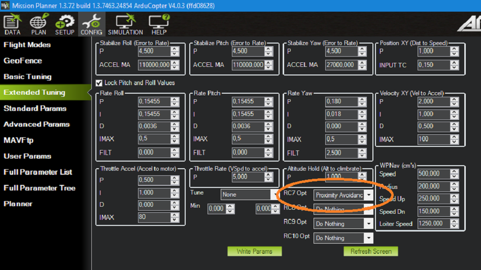 可选:您可以指定一个 RC 开关来启用 "避让",而不是默认情况下的 "始终打开"。在Mission Planner地面站中设置 RC7 以打开 "避让 "的示例: