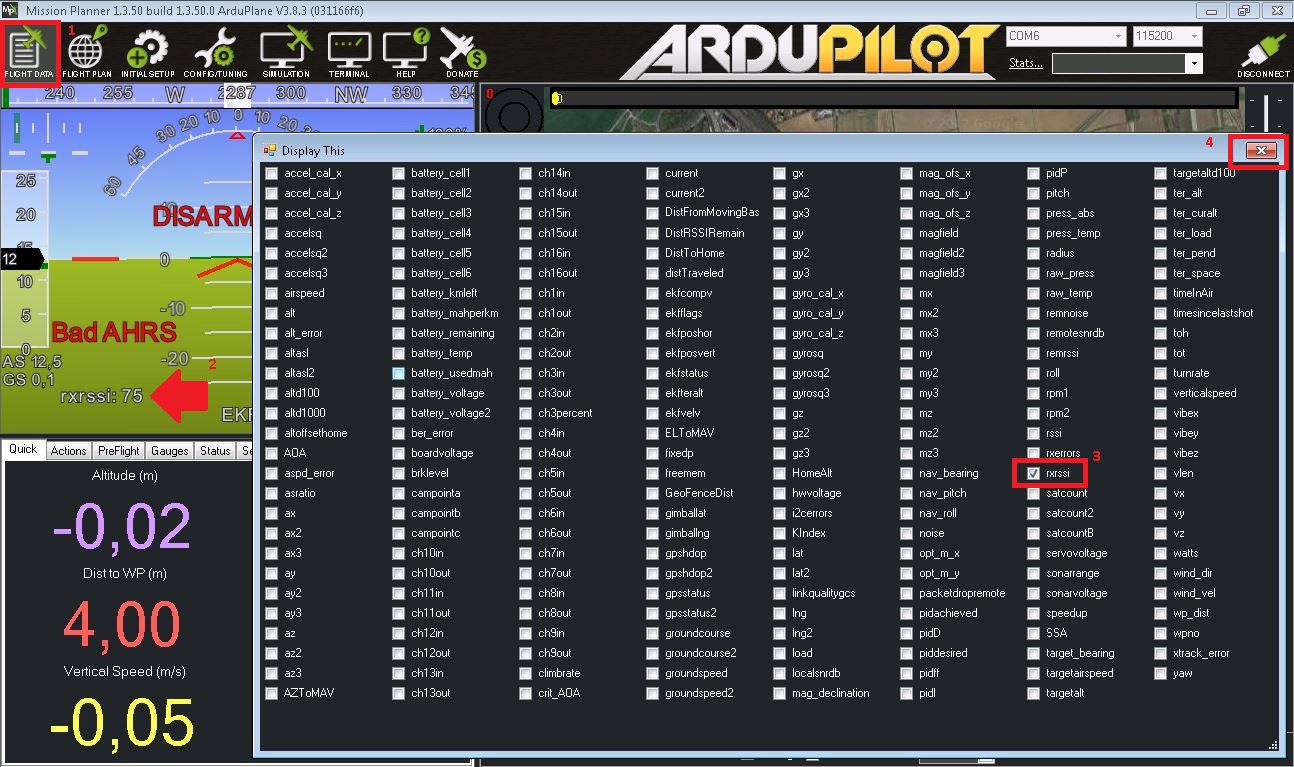 关键是要选择 rxrssi 来显示遥控链路的 rssi,而 rssi 和 remrssi 项则用于显示无线电调制解调器的地面和远程收发器的信号强度指示。