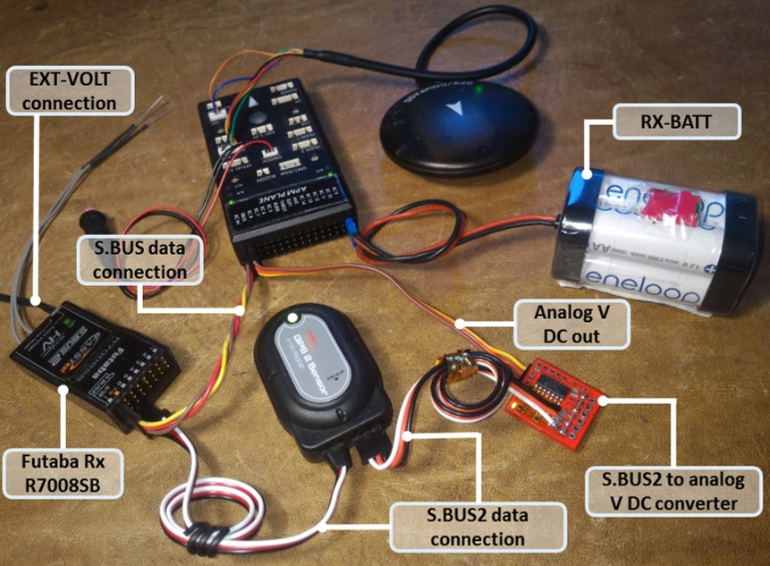 基本设置使用 Futaba R7008SB 下图显示的是一个接收器和一个附加的 S.BUS2 GPS 多传感器。使用 Futaba R7003SB 接收器