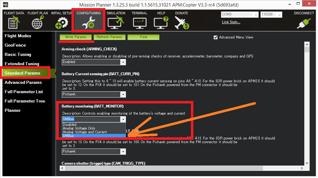 设置 BATT_MONITOR 到相应的智能电池型号组 BATT_I2C_BUS 到相应的总线编号