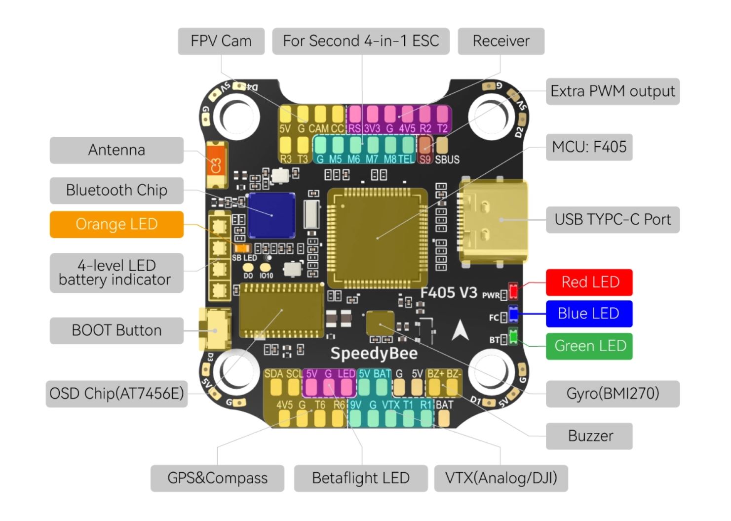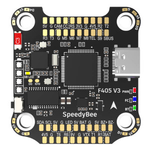 SpeedyBee F405 v3 没有内置指南针,但可以使用 SDA 和 SCL 焊盘上的 I2C 连接外部指南针。
