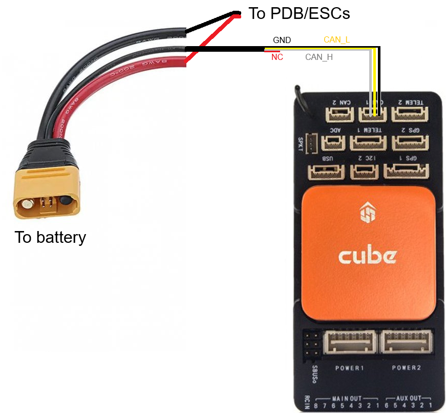 应使用带导线的 AS150U 母接头将电池的信号线连接到(飞行)控制器的 CAN 端口,如下图所示。