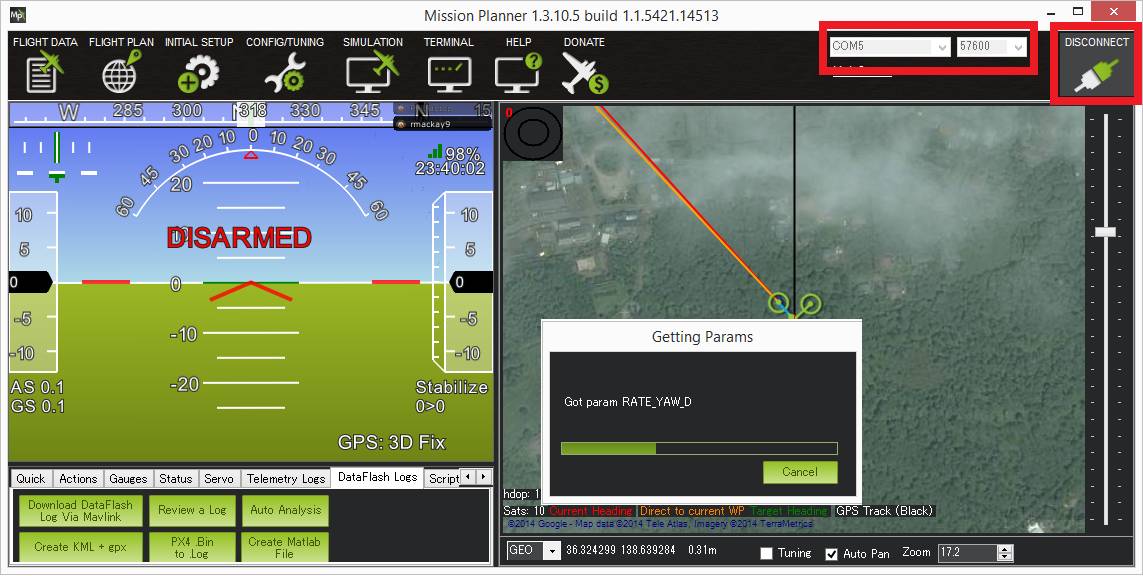 正确配置后,通过为 XBee 选择适当的 COM 端口并选择 57600 波特率,您就可以从地面站(即 Mission Planner)连接到飞行器。如果连接成功,但参数下载停滞,请参阅上文有关 CTS 和 RTS 的说明。
