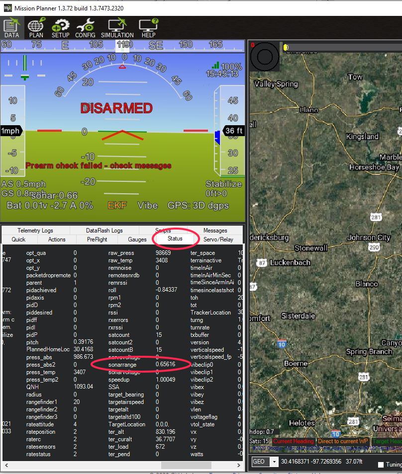 读取的距离 TeraRanger EVO 传感器可显示在 任务计划飞行数据 菜单。左侧的状态按钮将显示状态值。然后选择 "sonarrange"(声纳排列)。
