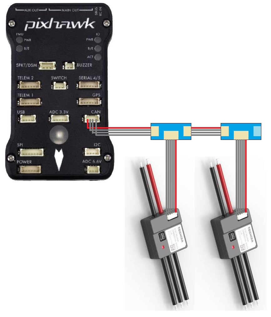 如果使用的是 Cube (飞行)控制器,CAN1 和 CAN2 的标示则相反。这些说明假定电调连接到 CAN1 端口,而 Cube (飞行)控制器上的 CAN1 端口标为 "CAN2"。