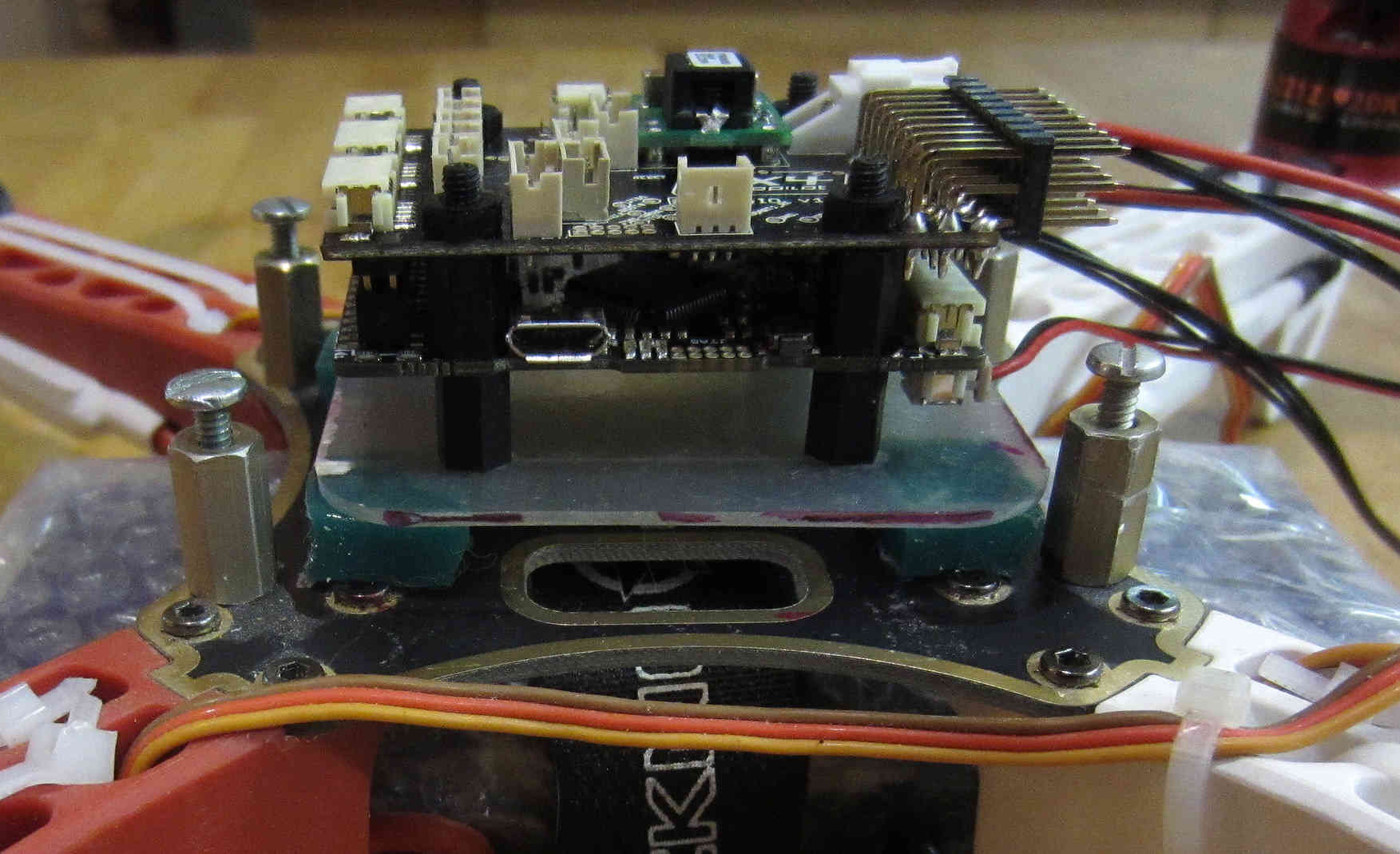 3. 用双面泡沫胶带将(飞行)控制器安装在这块板上。板上增加的质量可改善减震效果。