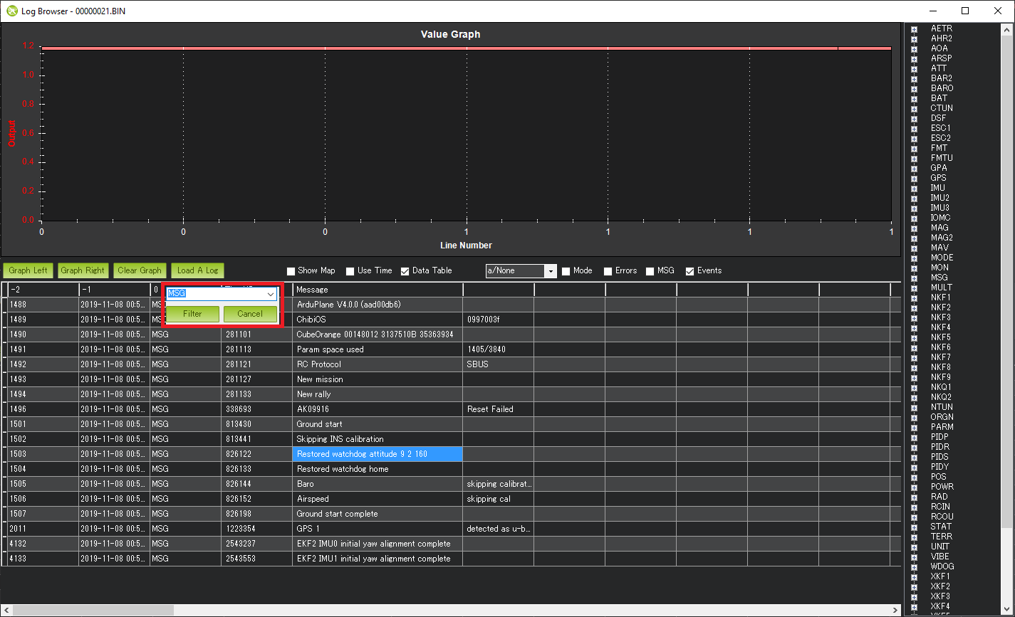 一种方法是查看数据闪存日志。如果对日志进行过滤,只显示 "MSG "信息,就会发现其中一些包含 "看门狗 "字样。这清楚地表明,前一个日志或飞行以看门狗重置结束。