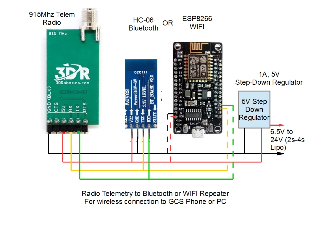 使用 ArduPilot 进行无线电遥测时,通常使用无线中继器比用 USB 电缆将遥测接收器连接到运行地面控制站 (GCS) 软件的 PC 或手机更为方便。这种中继器将遥测无线电接收器的输出转换为蓝牙或 WIFI,以便与地面控制站无线连接。如果使用的是基于手机的 GCS,则可以在飞行或驾驶载具时完全自由地移动。在使用定向接收天线的情况下,它允许将遥测接收器放置在远离 GCS 的高处,以获得最佳接收效果。