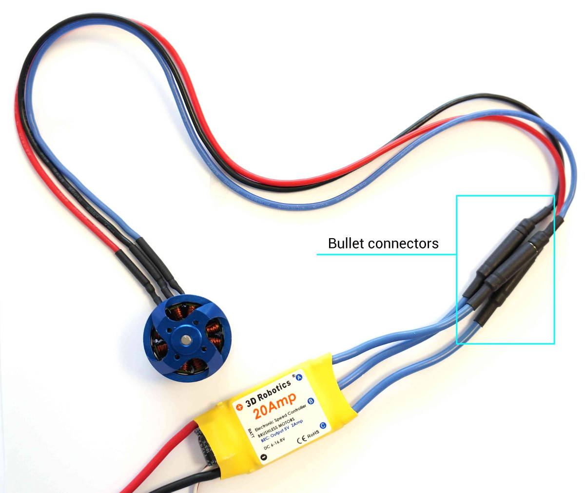 您需要将电机电缆连接到电子调速器 (ESC) 的子弹头连接器上(每个电机只能连接到一个 ESC)。