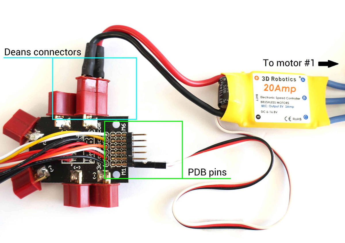 将电调的迪恩斯连接器连接至电源分配板 (PDB) 的迪恩斯连接器。根据电机编号将三线电缆从电调连接至 PDB 信号引脚(请参阅上面的链接,查找车架的电机编号配置)。将电机 1 的电调连接至标有 M1 的 PDB 引脚,将电机 6 的电调连接至标有 M6 的引脚,等等。