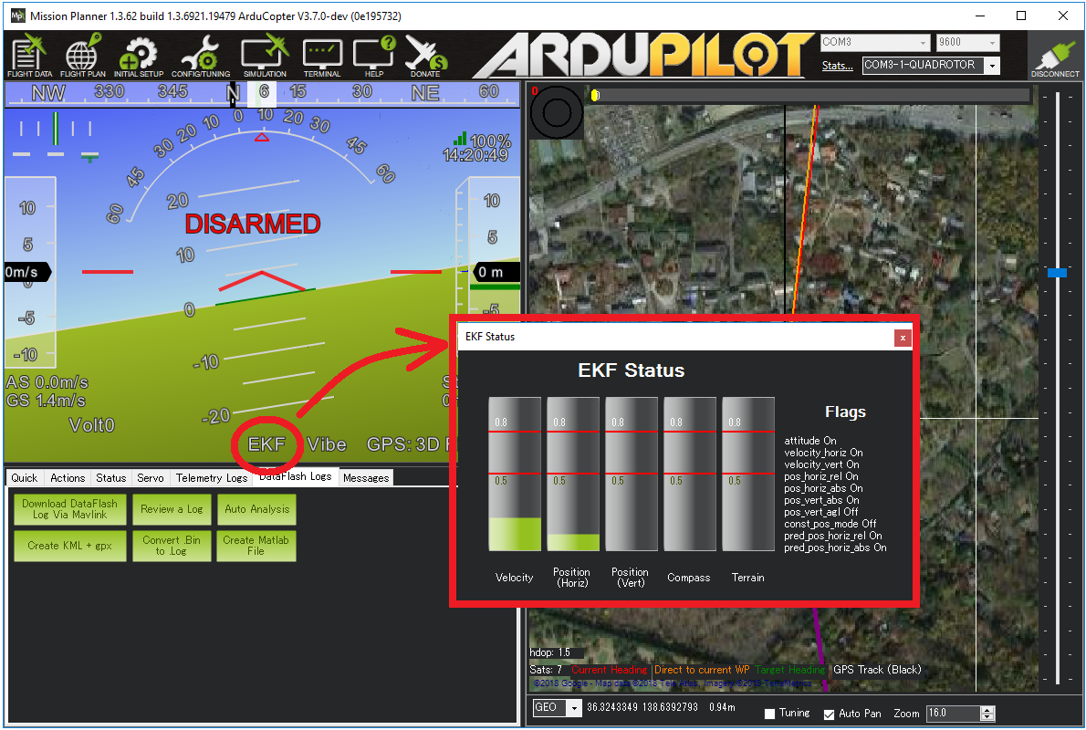 可以在地面站上实时查看差异。如果使用Mission Planner地面站,请单击 HUD 上的 "EKF "标签。