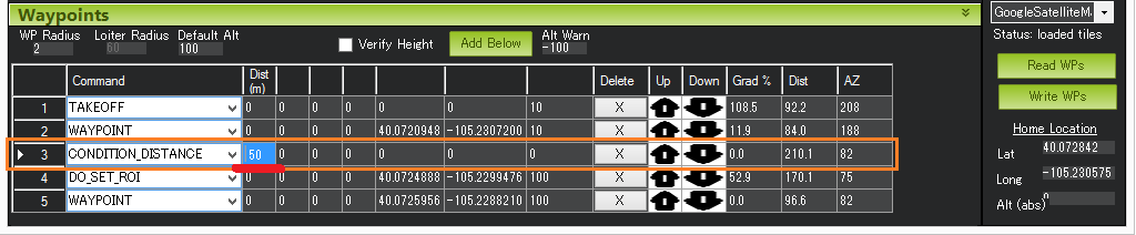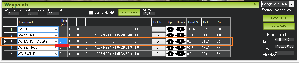 延迟下一条 "执行 "命令的启动时间,直到载具距离下一个航点达到指定的米数。在上例中,第 4 号命令(Do-Set-Roi)被延迟,只有当飞行器距离第 5 个航点 50 米以内时才会启动。注意: 该命令不会导致飞行器在任务期间停止或暂停,它只会影响 "执行 "命令。