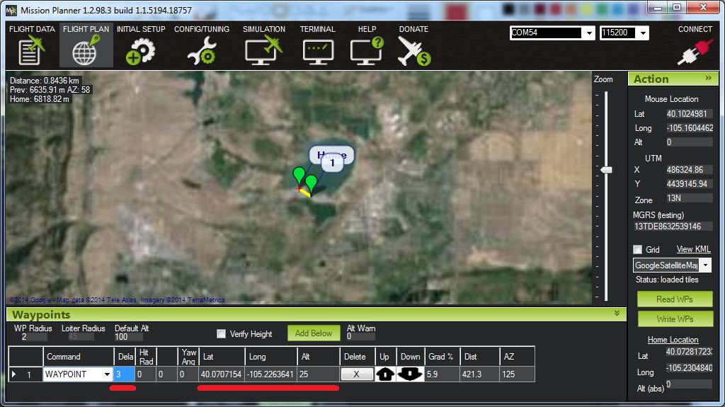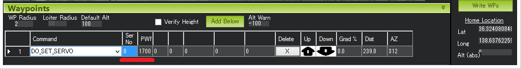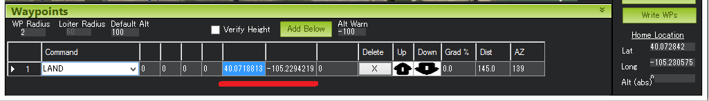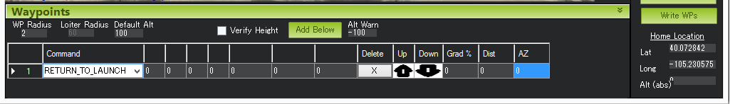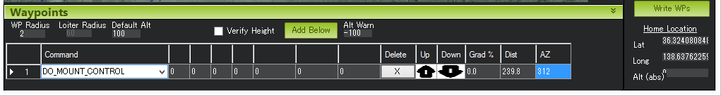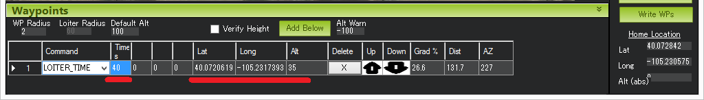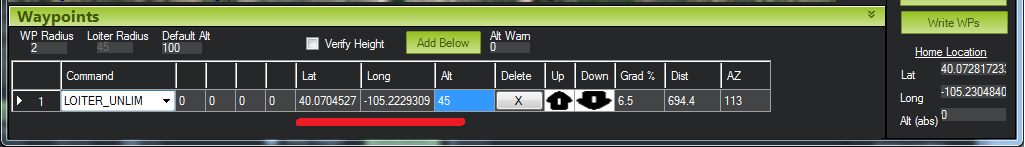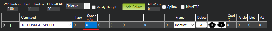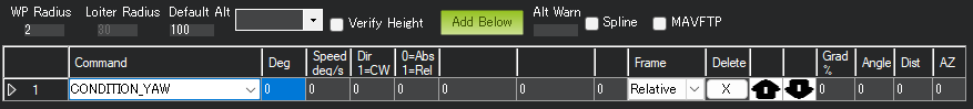 Hit Rad - 不支持 - 用于保存目标点到航点的距离(以米为单位),使航点符合完整条件。不支持该命令。取而代之的是 WPNAV_RADIUS 参数(见上图中的 "WP 半径 "字段,或通过标准参数列表进行调整)。即使是 WPNAV_RADIUS 仅在航点有延迟时使用。在未指定延迟的情况下,当载具追逐的虚拟点到达航点时,航点将被视为完成。这可能比载具提前 10 米(或更远),这意味着载具将在实际到达当前航点前很长时间转向下一个航点。