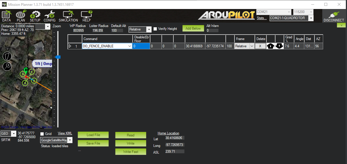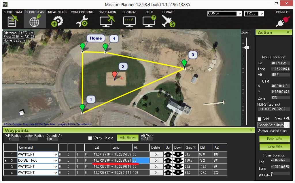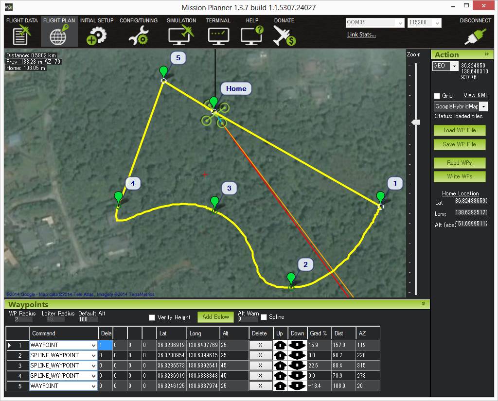 Mission Planner地面站显示了飞行器将要经过的路径。上图显示了花键的一些特征