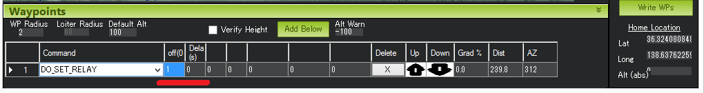 设置一个 继电器 引脚电压的高低。Mission Planner地面站中的列标记错误(此处有问题)。