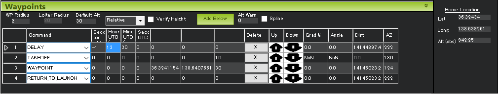 载具将保持在当前位置,直到指定的秒数过去或达到绝对时间。第一列("秒")为延迟秒数。如果要忽略此栏,则设置为-1。UTC时"、"UTC分 "和 "UTC秒 "字段可用于指定绝对时间(UTC时间)。世界协调时).上例将使飞行器在世界协调时下午 1:30 起飞。请注意,小时和/或分钟字段也可以通过设置为-1来忽略。