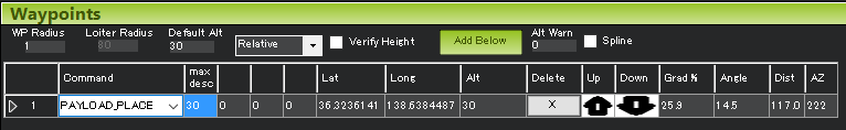 飞行器飞到指定位置并下降,直到(通过电机输出)感应到包裹已到达地面。然后释放抓取器,卸下货包并上升回到航点高度。第一列("Max Desc")为飞行器应下降的最大高度(以米为单位)。如果下降到这个高度后,货包仍未到达地面,则不会释放货包,飞行器将返回到航点高度,并进入下一个任务指令。控制该操作的参数(除了 机械手参数)是