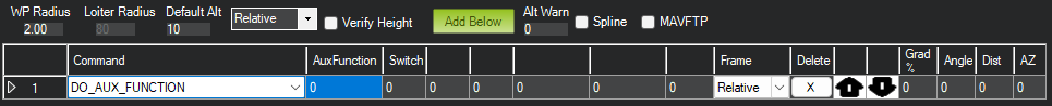 允许任何 辅助功能 无需设置辅助开关即可在任务中执行。AuxFunction "字段应设置为链接页面中的 "RCx_OPTION 值"。开关 "字段与辅助功能开关位置相对应,"0 "表示 "低","1 "表示 "中","2 "表示 "高"。