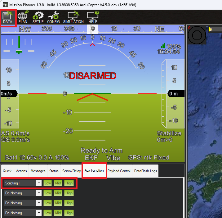 如果将使用遥控开关启动/停止调试,则设置 RCx_OPTION = 300,其中 "x "为遥控输入通道编号。或者将Mission Planner地面站辅助功能选项卡中的一行设置为 "脚本1"。