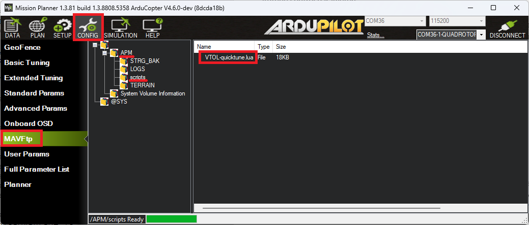 将脚本复制到(飞行)控制器 SD 卡的 APM/scripts 目录中。如果使用 MP,使用 "配置"、"MAVFtp "屏幕可能最简单