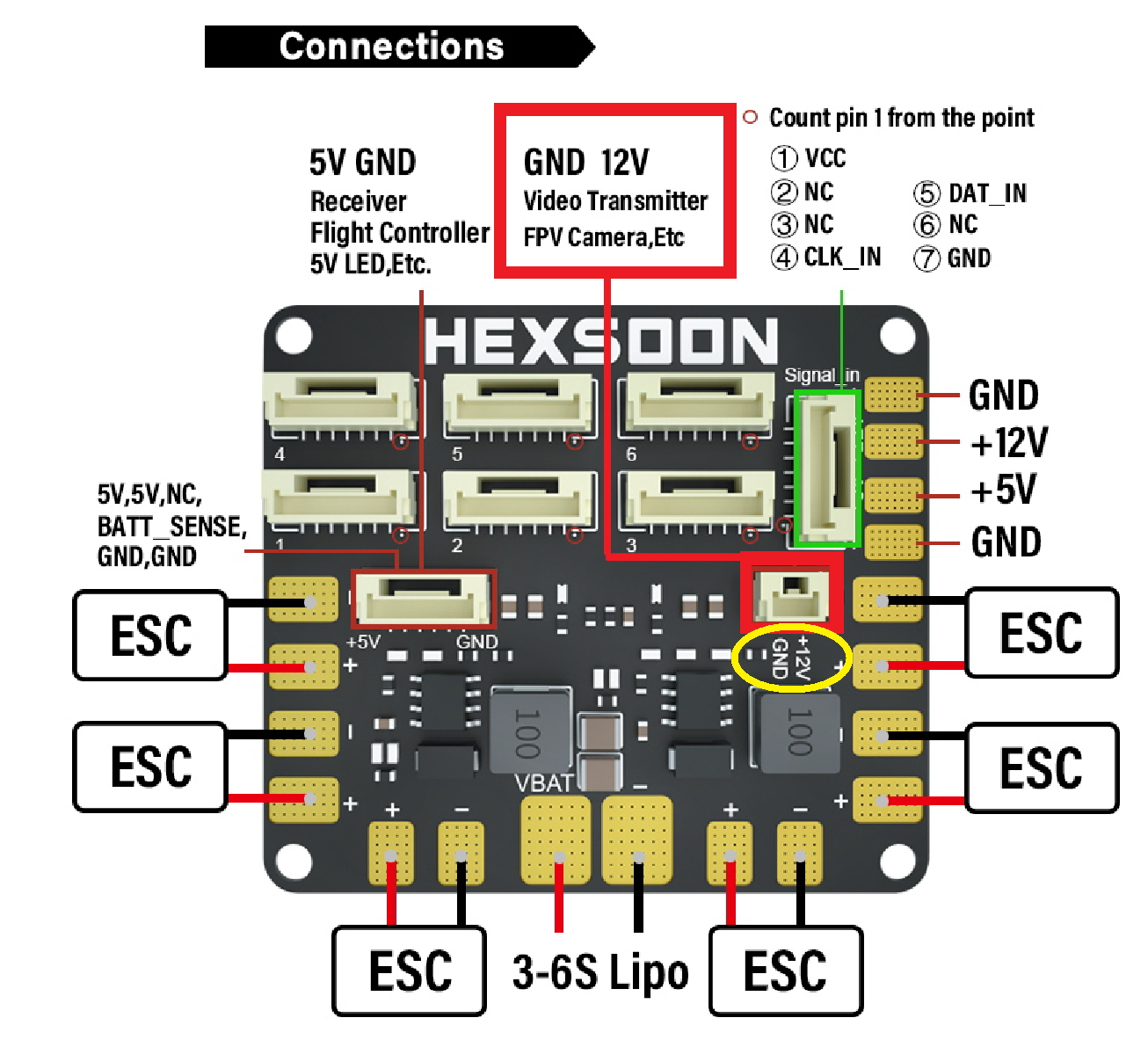 PDB 有一个用于 "视频发射器 "的 12V 引脚,但请注意,与同等的 Herelink 电源线相比,2 针 JST 连接器的 GND 和 12V 引脚是反的。