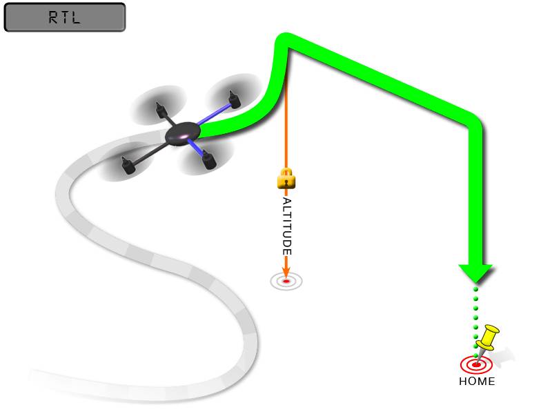 RTL 模式(返回启动模式)可将 Copter 从当前位置导航至原点上方悬停。RTL 模式的行为可由几个可调参数控制。本页介绍如何使用和自定义 RTL 模式。