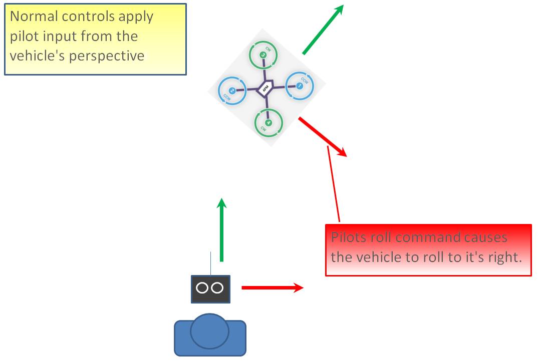 在未启用 "简单 "或 "超级简单 "功能的情况下,飞行员的发射器摇杆输入将按照飞行器的方向应用。例如,在上图中,当飞行员向右滚动输入(红色)时,飞行器就会向右滚动。