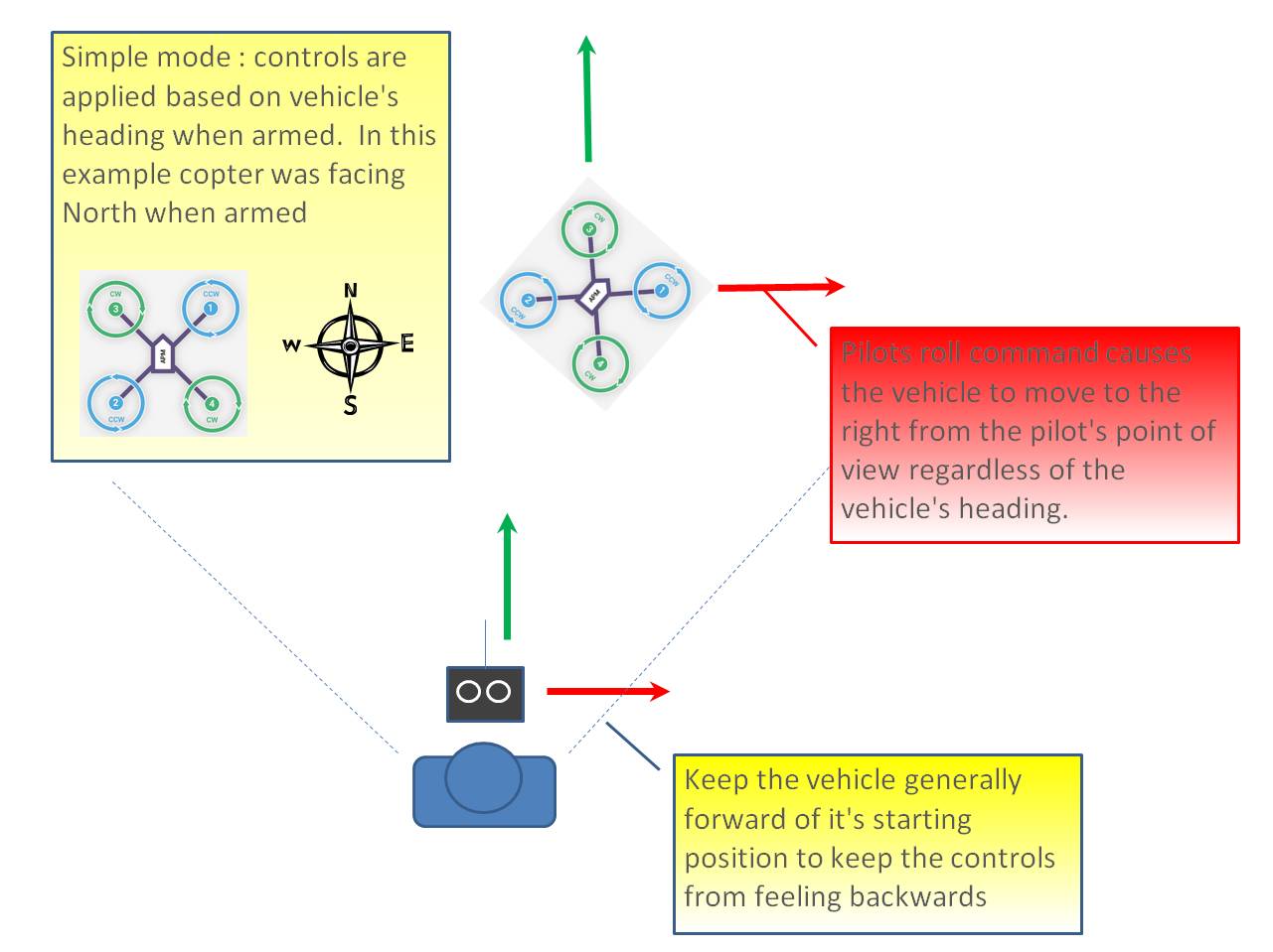 简单模式允许您在起飞时根据飞行器的航向控制飞行器,并且只依赖于良好的指南针航向。