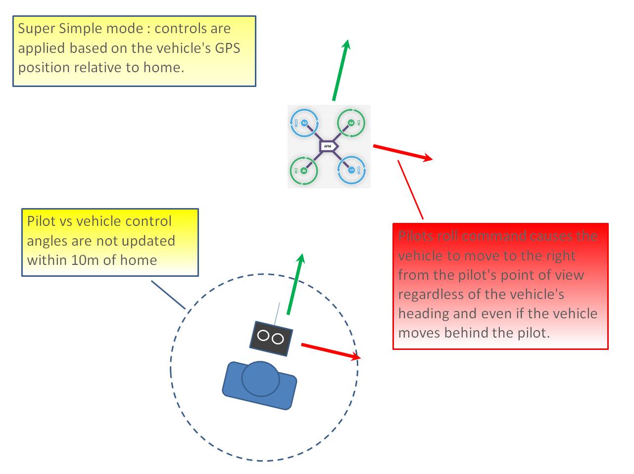 超级简单模式允许您根据原点方向(即上膛位置)控制旋翼飞行器,但需要良好的 GPS 定位。