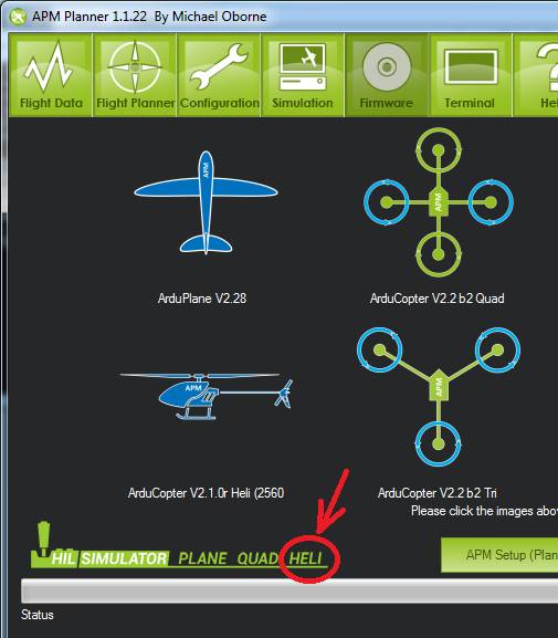 在 AP Mission Planner地面站上,您可以在固件上传屏幕的左下方找到 Heli 按钮。