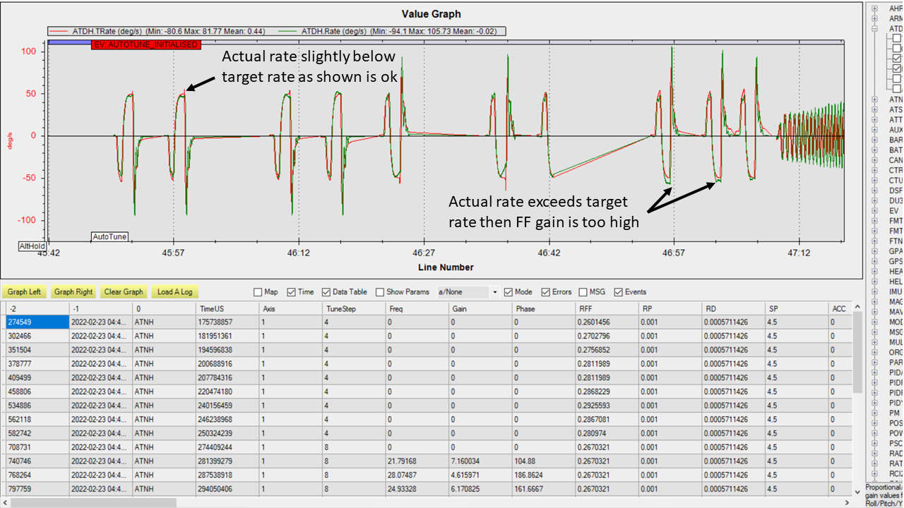 在时间历程中,FF 增益的一个良好捕捉示例显示了飞行稳定调整过程中的调高部分。在达到稳定状态时,实际速率略低于目标值。接下来是音调降低的 FF 调整,可以看到在达到稳定状态之前,速率似乎有所下降。FF 增益增加了,但可以看到实际速率超过了目标值,导致 FF 增益过高。如果您看到类似的行为,最好在速率略低于目标速率时找到 FF 增益,并将其手动输入到 ATC_RAT_xxx_FF 收益。