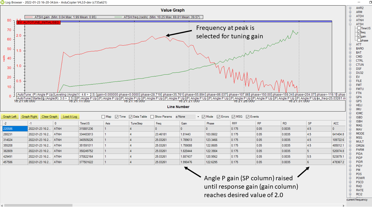在本例中,响应增益 (ATSH.gain) 的峰值显示在图表中。下表显示了频率扫描后完成的驻留,其中 ATC_ANG_xxx_P 直到响应增益达到 最大响应增益 在本例中为 2.0。确保找到正确的频率非常重要。在调整偏航轴等情况下,响应增益可能没有峰值,选择的低频可能不会导致增益的正确调整。在这种情况下 ATC_ANG_xxx_P 因此,如果起始值为 4.5,则手动将其设置为 5.5,然后运行 ATC_ANG_xxx_P 再次调整。