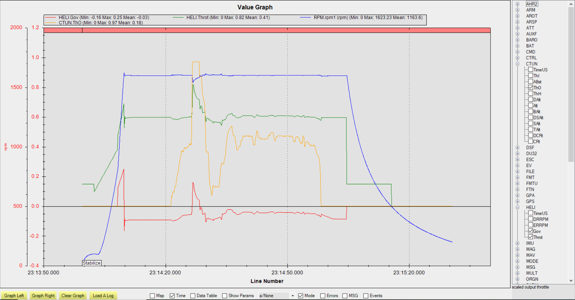 在使用节流阀曲线或内部调速器的模式下,有旋翼飞行器节流阀输出和调速器输出(HELI.x 日志信息)的记录项目 (H_RSC_MODE =3 或 4)。下面是调速器运行的日志图示例。图中显示的是启动过程。调速器扭矩限制器以 50% 的转子速度启动,直至调速器接合。HELI.Gov 信号仅为调速器输出。HELI.Throt 是油门输出,包括油门曲线和调速器。集体显示了在大约 25 秒时急剧的集体输入。大约有 50 RPM 的下降,但很快就恢复了。着陆后,当电机联锁被禁用时,调速器脱离(调速器输出归零)。