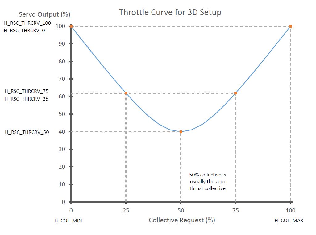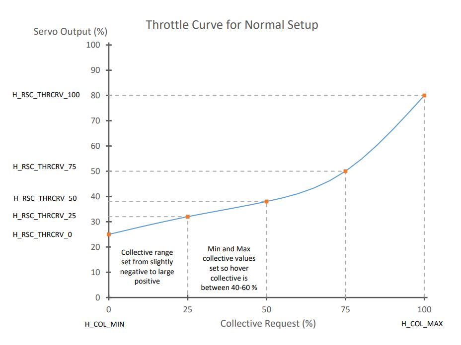 ArduPilot 将在以下两个参数之间进行样条曲线拟合 H_RSC_THRCRV_X 设定点,以产生相对于集合点的平滑油门伺服输出。