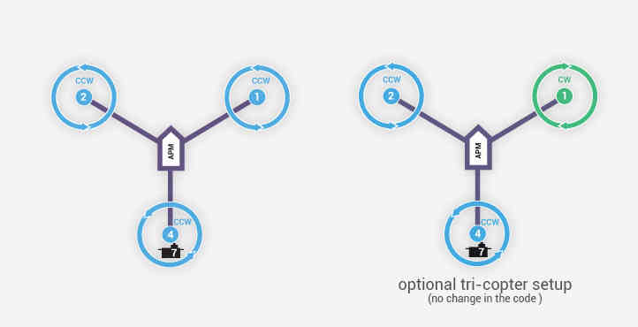 本页概述了让 TriCopter 飞行所需的特殊设置。更多 设置多旋翼飞行器的一般说明 应用于设置的所有其他方面。