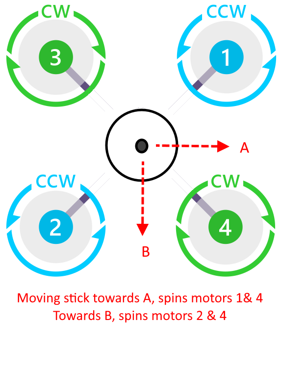 进入该模式后,将发射机的滚动杆和/或俯仰杆偏离中心,就会反向旋转指定的一对电机,将推力增加到全摇杆时的最大值。