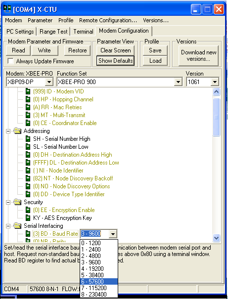 这将使模块回到 9600 波特。将 X-CTU PC 设置为该波特率并进行测试。它应该会反馈已识别。