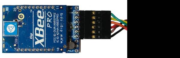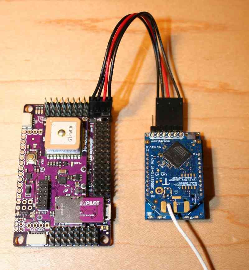 我们推荐使用 3DR 四线 Xbee 电缆,它与上图所示的官方无线遥测套件一起提供。它专为连接卓典蜂适配器和 APM 而设计,可提供最整齐、最安全的连接。