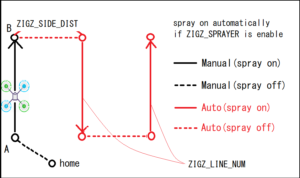 注册字段边点后,如果您的 RC 切换器配置了 RCx_OPTION = 83(之字形自动模式),您可以按照可编程的距离间隔从一边到另一边自动覆盖田地,如果配备了喷雾器,还可以启用喷雾器。