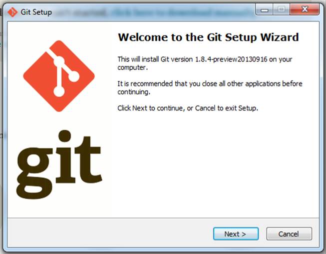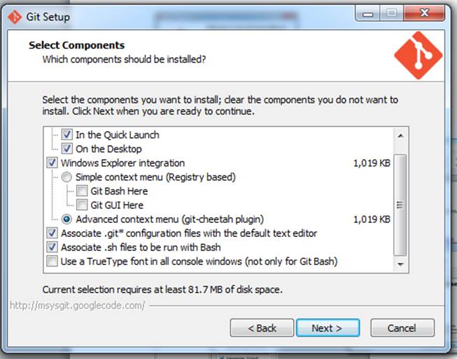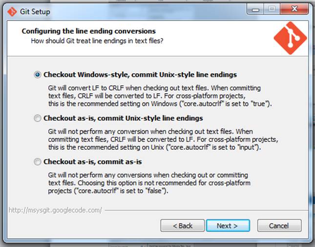 选择 结账窗口 项目和 下一页 按钮,然后选择 从 Windows 运行 Git 项目和 下一页 按钮。
