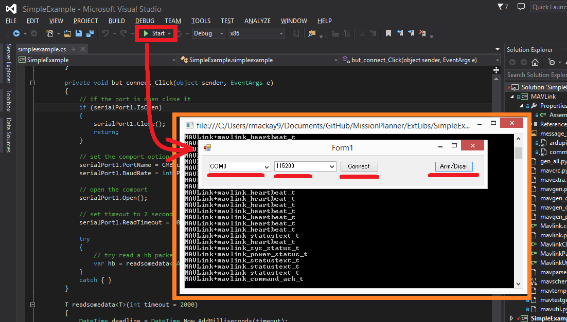 SimpleExample "解决方案是一个近乎最小的应用程序,用于演示 C# 程序如何连接到飞行器并使其上膛或撤膛。与完整的Mission Planner地面站相比,该示例的依赖性要少得多,而且更易于构建和理解。