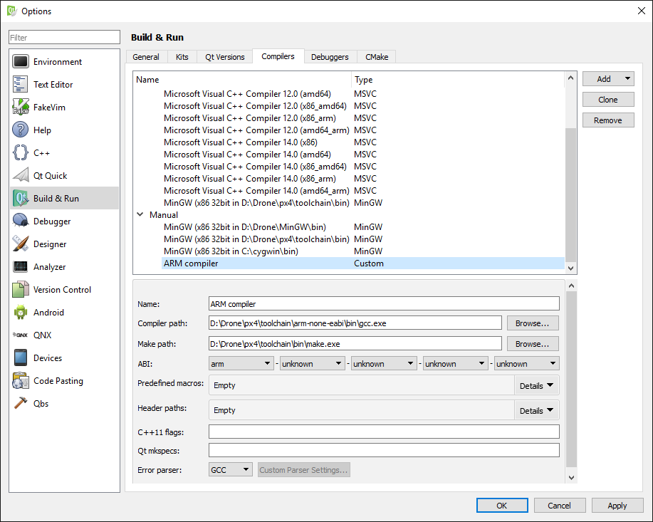 首先点击 编译器 标签页,然后 添加 在编译器列表的右侧。为编译器选择一个易于识别的名称,并确保编译器和制作路径指向 PX4 工具链(Windows)或下载的 gcc-arm 交叉编译器(Linux)的可执行文件。同时选择 "GCC "作为错误解析器。