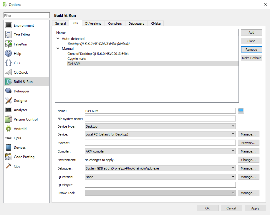 为您的构建工具包选择一个易于识别的名称,并确保填写正确的编译器(您刚刚添加的编译器)和 PX4 工具链中的调试器。
