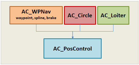 在最高级别上,AC_WPNav、AC_Circle 和 AC_Loiter 库是同级库,它们都使用 AC_PosControl 库。