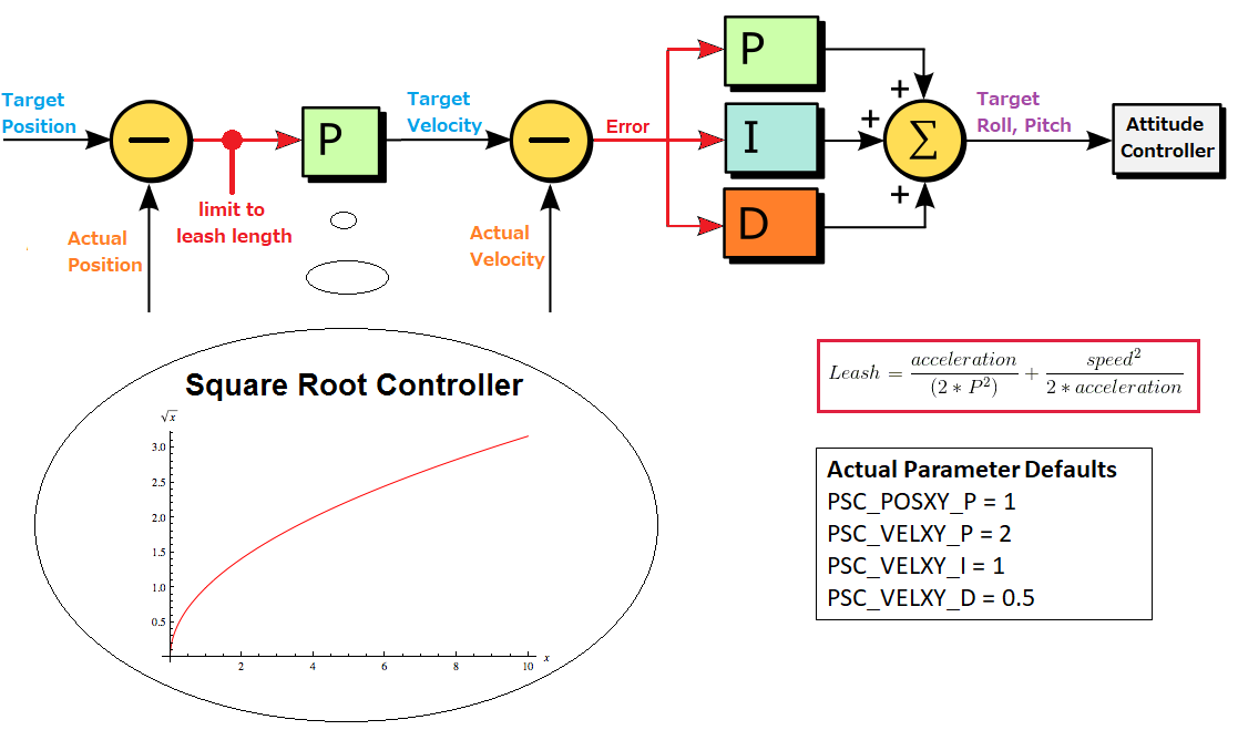 XY 轴使用位置 PID 将位置误差转换为目标速度。速度 PID 将速度误差转换为所需的加速度,再将加速度转换为所需的倾斜角,然后将其送入姿态控制库。